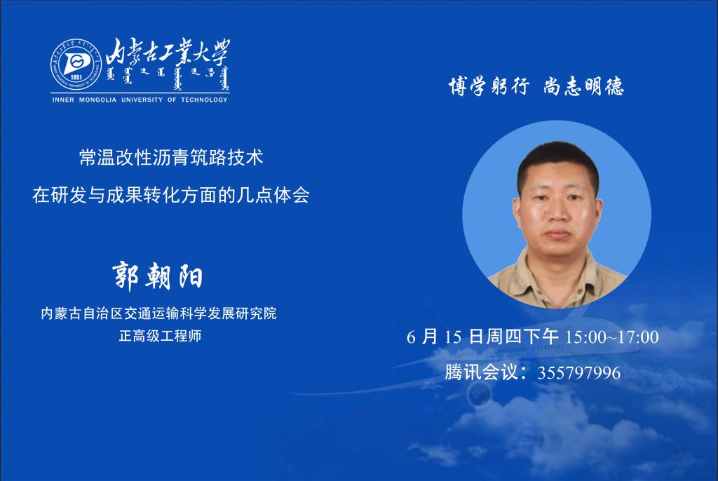 郭朝阳(1982.10——河北武安人),正高级工程师,交通运输部青年科技英才、内蒙古自治区草原英才,内蒙古自治区交通运输科学发展研究院,总工程师,原交通运输部科学研究院道路结构材料研究中心研发部主任、实验室主任。主要从事沥青路面的设计、施工、养护技术研就,提出了常温改性沥青混合料材料组成设计方法及常温施工关键技术,攻克了沥青路面低温施工、大掺量厂拌常温再生、可减薄沥青铣刨厚度并超薄摊铺罩面等成套施工技术难题。成果达到国际领先水平,并获得2020年度国家科技进步奖提名。