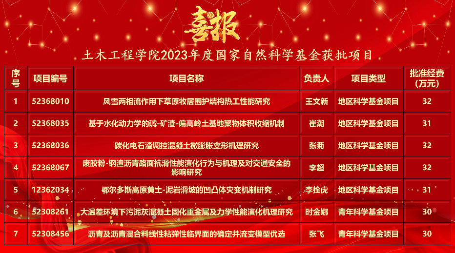 2023年8月24日,国家自然科学基金委员会发布了2023年集中接收申请项目的评审结果,公司喜获立项资助7项,其中,获青年科学基金项目2项、地区科学基金项目5项,取得历史新突破,获批经费218万。