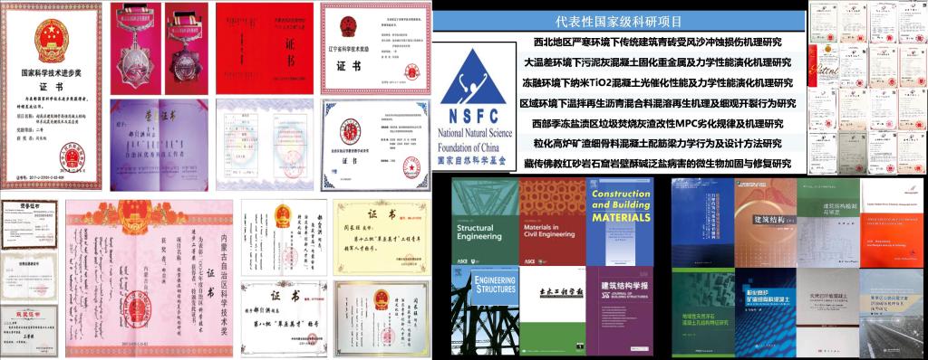 固废资源化与工程材料性能调控:针对内蒙古固废产量大且利用率低、区域环境影响土木工程材料性能等问题,开展固废资源高值低碳利用、复杂环境下材料性能劣化机理及其提升关键技术等研究,在基于多尺度力学方法研究土木工程材料性能方面形成特色与优势。成果应用于沿黄高速、新机场等重大工程。获省部级科技奖12项(一等奖3项),编制国家、地方标准8部。