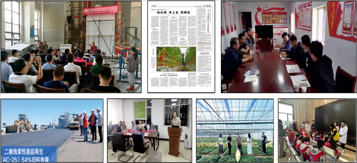 围绕厅局地方政府、行业企业、协会学会等需求,组织“科研团队+科技特派员”工作模式开展服务。受内蒙古住建厅、生态环境厅、乡村振兴局等委托完成多个调研报告,为决策提供依据;在全区建设“党员科技服务工作站”5个,深入各盟市旗县开展产业对接和技术服务;投身内蒙古大型场馆、地铁与城市快速路、新机场等重大工程,乡村振兴等民生工程,其中,“农村牧区脱贫攻坚危房鉴定改造”得到人民日报专项报道,“太阳能设施农业土壤跨季度储供热技术及产业化应用”成果入选“十四五”教育部高校科技助力乡村振兴示范项目30个典型案例,是全国入选的唯一土木类案例;编制《农村牧区居住建筑节能设计标准》等30余项国家、地方、行业标准;学科点牵头内蒙古土木工程学会、内蒙古勘察设计协会等行业组织,为内蒙古土建领域高质量发展贡献力量。