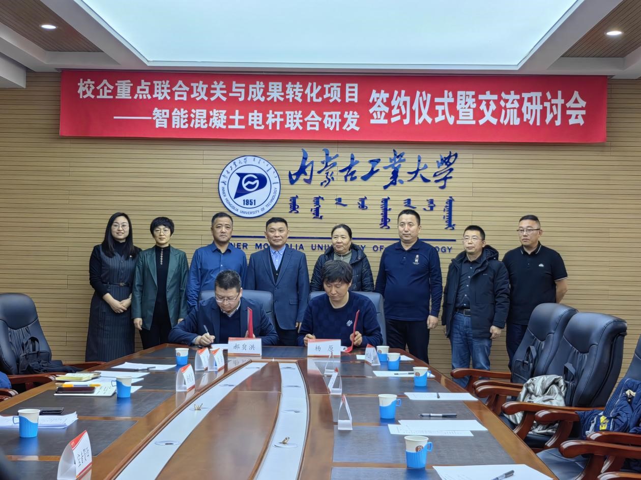 1月12日上午,校企重点联合攻关与成果转化项目---智能混凝土输电杆联合研发项目签约仪式在新城校区明德楼举行。公司党委委员、常务副董事长宝音,公司党委委员、副董事长郝贠洪出席活动。公司科研处、产业技术转移与成果转化中心和beat365正版相关负责人和教师代表参加;合作企业乌兰察布市集宁区利元水泥制品有限责任公司、内蒙古利元管涵工程有限责任公司负责人,相关电力单位内蒙古电力勘测设计院有限责任公司、内蒙古电力科学研究院、内蒙古鲁电蒙源电力工程有限公司、乌兰察布市电业局派代表参会。