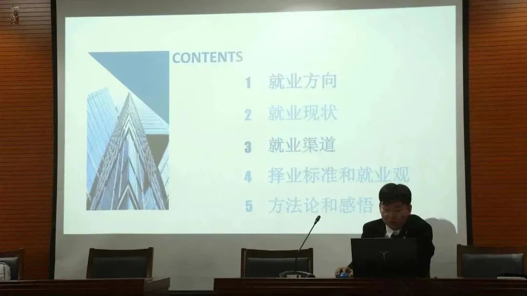 之后王韫辉同学以“思想引领行动,格局启航人生”为主题为大家介绍毕业生就业创业必备的条件和目标。首先他明确指出要了解所学专业的就业方向、就业前景、就业现状,提倡大家要有忧患意识。最后他还强调要树立良好的择业标准及就业观。