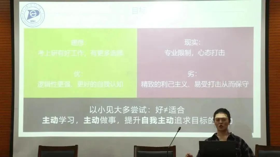 宣讲会中,首先由田蕾同学以“提升自我,启航未来”为主题为大家介绍毕业后继续学术深造的重要性,并且根据目前考研形势提醒大家“现在稳不代表未来稳”。强调要分清里程碑和终极目标。在宣讲最后,田蕾同学还为大家提供了小建议。