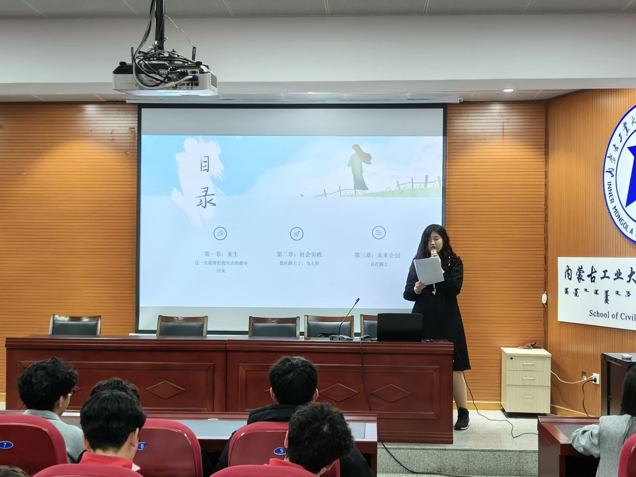 靳睿颖同学号召同学们积极参加文体活动和志愿服务等来锻炼自己的能力, 她还告诉同学们大学是一段新的征程, 应该热爱老员工活, 合理分配安排时间, 认识到每一件事的重要性, 应对挑战, 把握机遇。