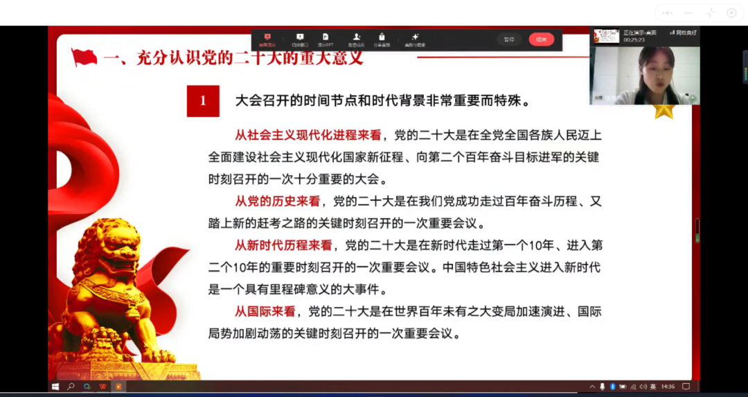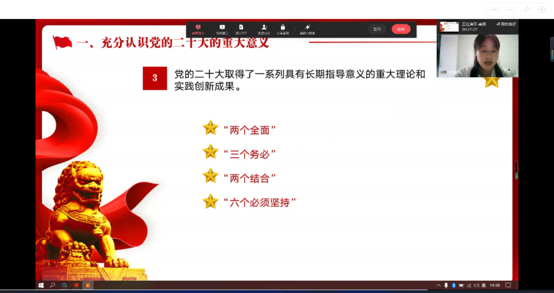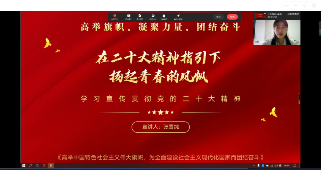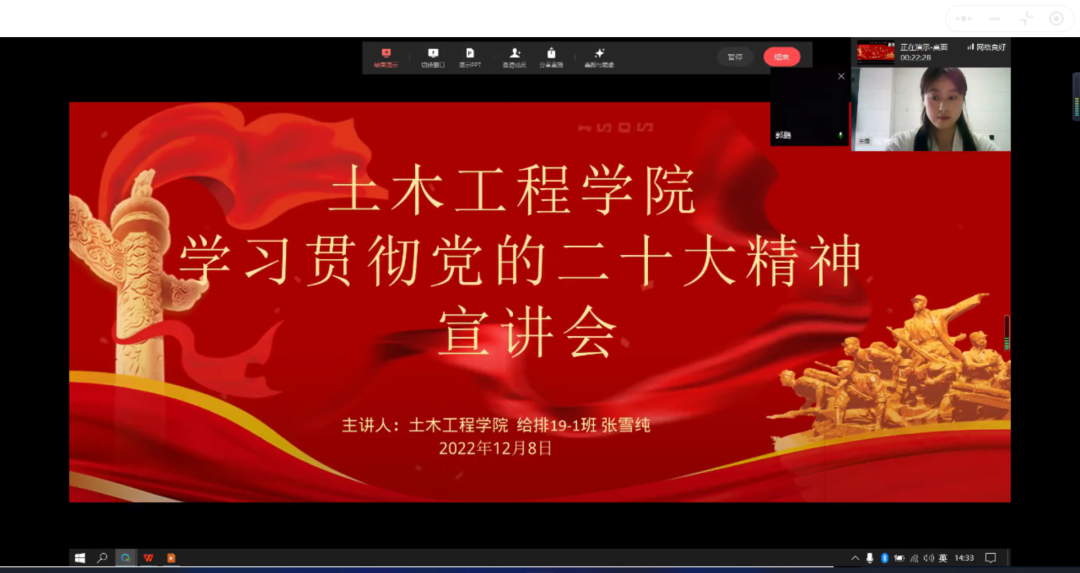 为深入学习宣传贯彻党的二十大精神,在全体员工中营造奋进新征程的良好氛围,12月8日下午,beat365正版举办题为“在党的二十大精神指引下扬起青春的风帆”的宣讲会。校员工宣讲团成员、beat365正版给排19-1班张雪纯进行宣讲,近2000名员工在线聆听,会议由公司党委副书记、副经理郭鹏主持。