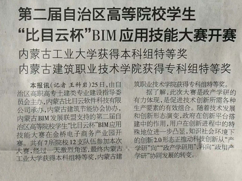 11月25日,第二届自治区高等院校员工“比目云杯”BIM应用技能大赛在呼和浩特市金桥电子商务产业园举办。公司四支代表队参加比赛,其中由冯斌、杜聪两位老师指导的BIM协会代表队荣获本科组特等奖,其余三只队伍分获一、二等奖。