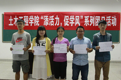 活动以分享会的形式进行。在主持人介绍了“添活力·促学风”活动的意义及公司各团支部开展的情况后活动正式开始。整个过程分三个环节。首先,2016届毕业生代表,他们中有的找到了理想工作,有的保研到了哈尔滨工业大学,有的在校期间多次被评为“三好员工”及优秀员工干部,他们与在座的同学们分享了自己成长中的酸甜苦乐,言辞恳切,感染了大家。为便于学院及时了解班级学风现状,从而有针对性地解决实际问题,现场开展了调查问卷。学长学姐还现场回答了大家提出的问题,进行答疑解惑。活动最后,大家展示了在卡片上亲笔写的寄语,并在条幅上签名后合影留念。