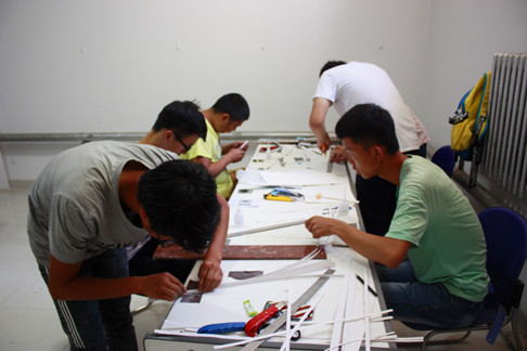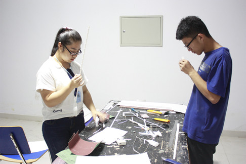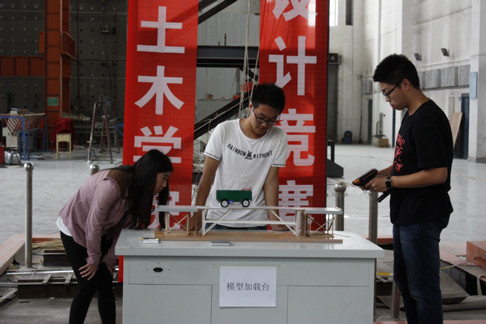 本届竞赛要求每组运用0.35毫米厚的竹皮设计制造出一座承重结构桥,通过比较荷重比来进行成绩考核。每支队伍经过赛前的积极准备,所设计作品结构新颖、承载能力强,在加载比赛的现场,由队员代表对作品进行充分讲解,其他队员认真耐心地操控着装有铁块的小车,使其平缓通过他们所设计的桥架构。现场一次次地成功演绎了”四两载千斤”的精彩。评委老师从理论和实践两个方面队各参赛队给予了指导和建议,并明确指出优点和不足。最终,历经层层筛选,评选出了一等奖1名、二等奖2名、三等奖3名、最佳创意奖1名、最佳手工奖1名。