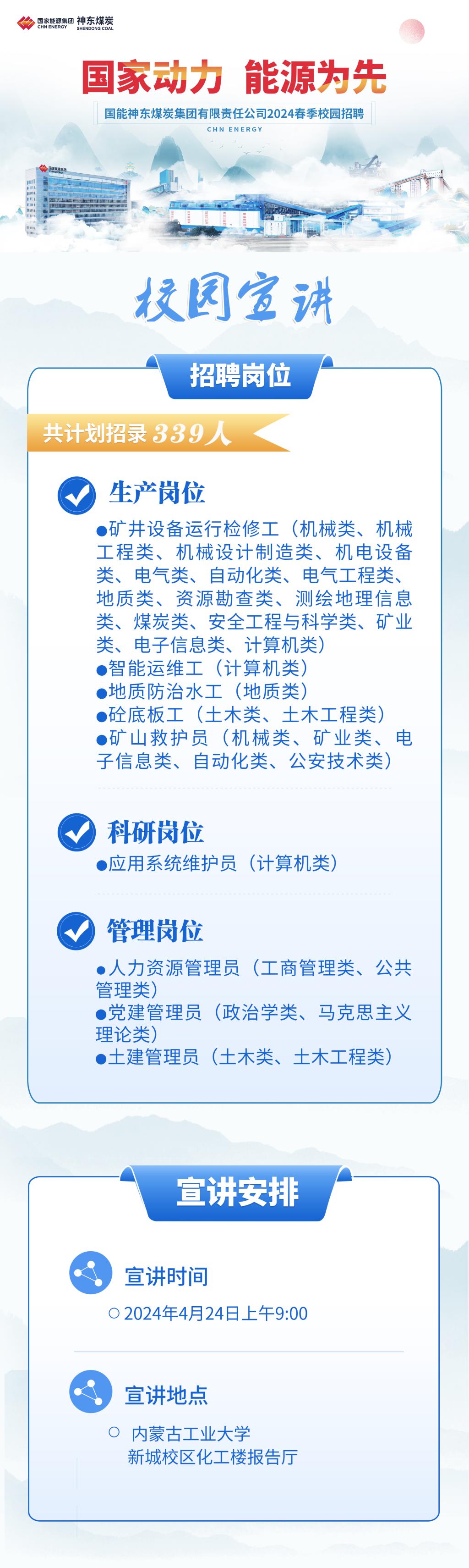 一.时间:2024年4月24日(周三)上午9:00二.地点:新城校区化工楼报告厅三.主讲人:国能神东煤炭组织人事部马玉会部长四.主讲内容:2024年春季招聘宣讲及就业相关内容五.招聘专业:机械类、机械工程类、机械设计制造类、机电设备类;电气类、自动化类、电气工程类;煤炭类、地质类、矿业类、资源勘查类;土木类、土木工程类、测绘地理信息类;电子信息类、计算机类;安全工程与科学类;工商管理类;公共管理类;政治学类;马克思主义理论类。