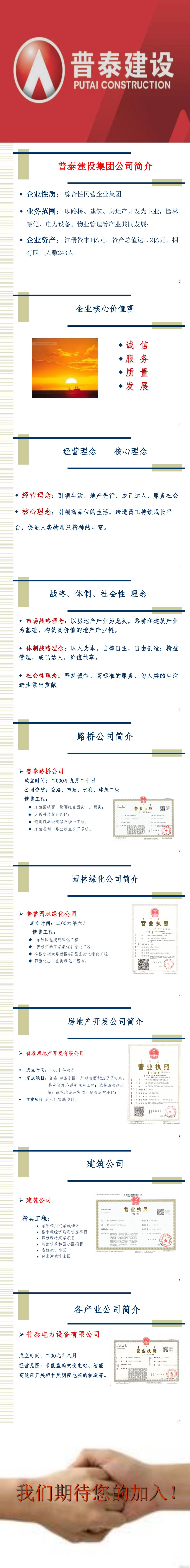 以普泰路桥为基础产业板块的普泰建设集团经过二十多年的艰苦奋斗,已逐步走出一条良性、稳步的发展之路。集团公司坚持“诚信、质量、服务、奉献”的核心价值观;坚持“以人为本、服务社会,科技先行、质量至上,市场导向、持续发展,经济效益和社会效益兼顾”的企业经营理念;始终本着高起点、高标准、高质量的创业原则,努力打造对社会负责,受人民信赖和尊重的一流企业。