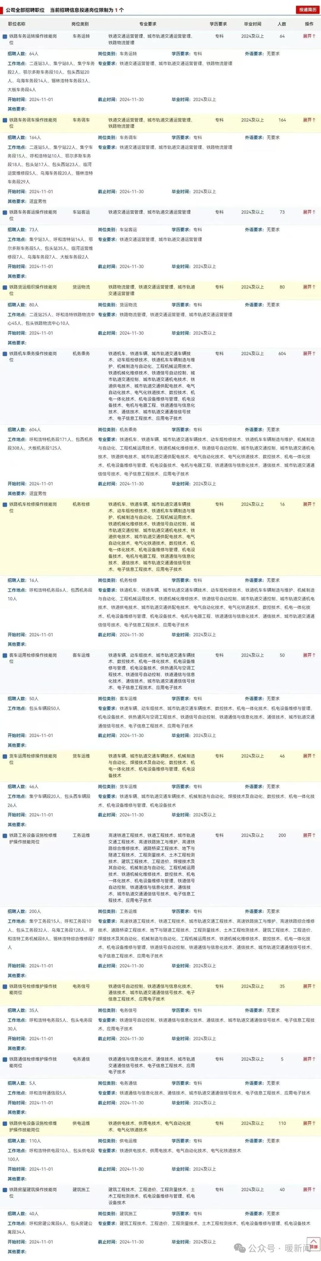 呼和浩特局集团有限公司根据企业发展需求,拟招聘普通高等院校大学专科(高职)学历毕业生1487人,报名采取网上报名方式,报名时间为2024年11月1日-2024年11月30日。有意应聘的毕业生在规定时间内登录“中国铁路人才招聘网”(http://rczp.china-railway.com.cn)进行报名。