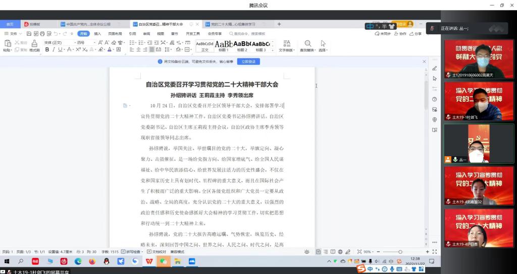 11月23日下午,土木工程(交通土建)专业员工党支部线上召开党的二十大精神学习研讨会。党支部书记丛一主持会议, 5名党员参加会议。