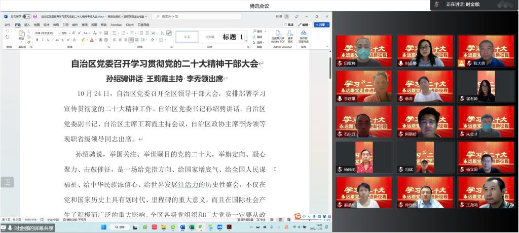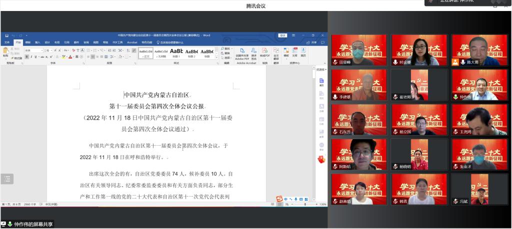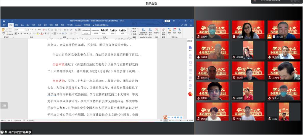 会上,全体党员集中观看了《习近平总书记在中共中央政治局第一次集体学习时的重要讲话精神》视频,支部书记时金娜领学了自治区党委书记孙绍骋在《自治区党委召开学习贯彻党的二十大精神干部大会》讲话精神,支部宣传委员陈大勇领学了自治区党委书记孙绍骋在《党的二十大精神专题读书班暨内蒙古自治区党委理论学习中心组集体学习》讲话精神,支部组织委员仲作伟领学了《中国共产党内蒙古自治区第十一届委员会第四次全体会议公报》。