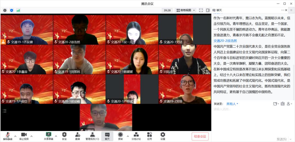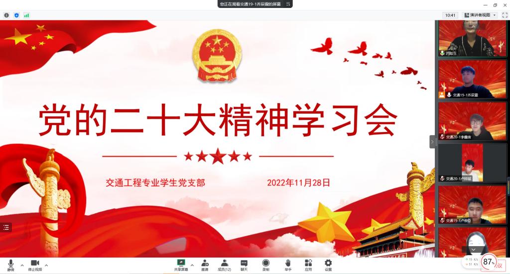 为深入学习贯彻党的二十大精神,切实将全体员工党员的思想、认识和行动统一到党的二十大精神上来,11月28日晚,交通工程专业员工党支部线上召开了党的二十大精神专题学习会,支部全体党员参加会议。