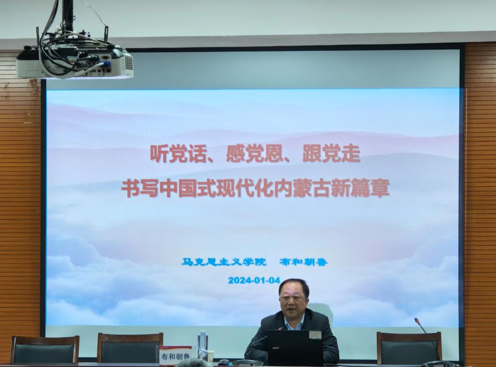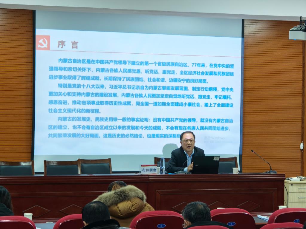 在主题宣讲中,布和朝鲁教授以通俗易懂的语言,生动的历史事实,详实的案例数据,阐释了 “五句话”的事实和道理,阐释了习近平总书记对内蒙古的关怀厚爱和期望重托,阐释了国务院《关于推动内蒙古高质量发展奋力书写中国式现代化新篇章的意见》。