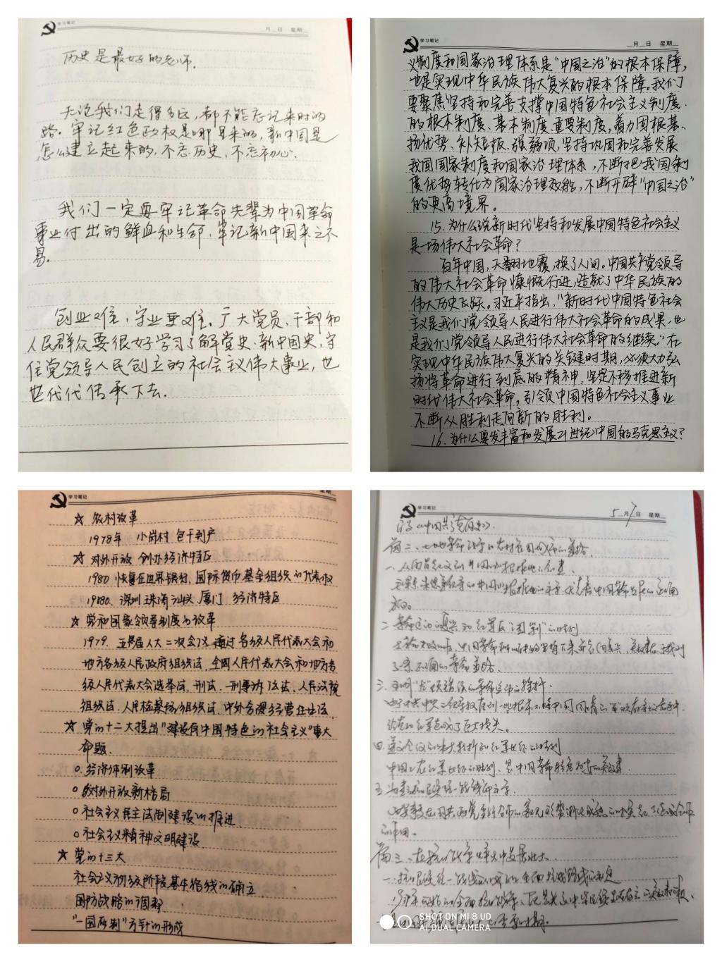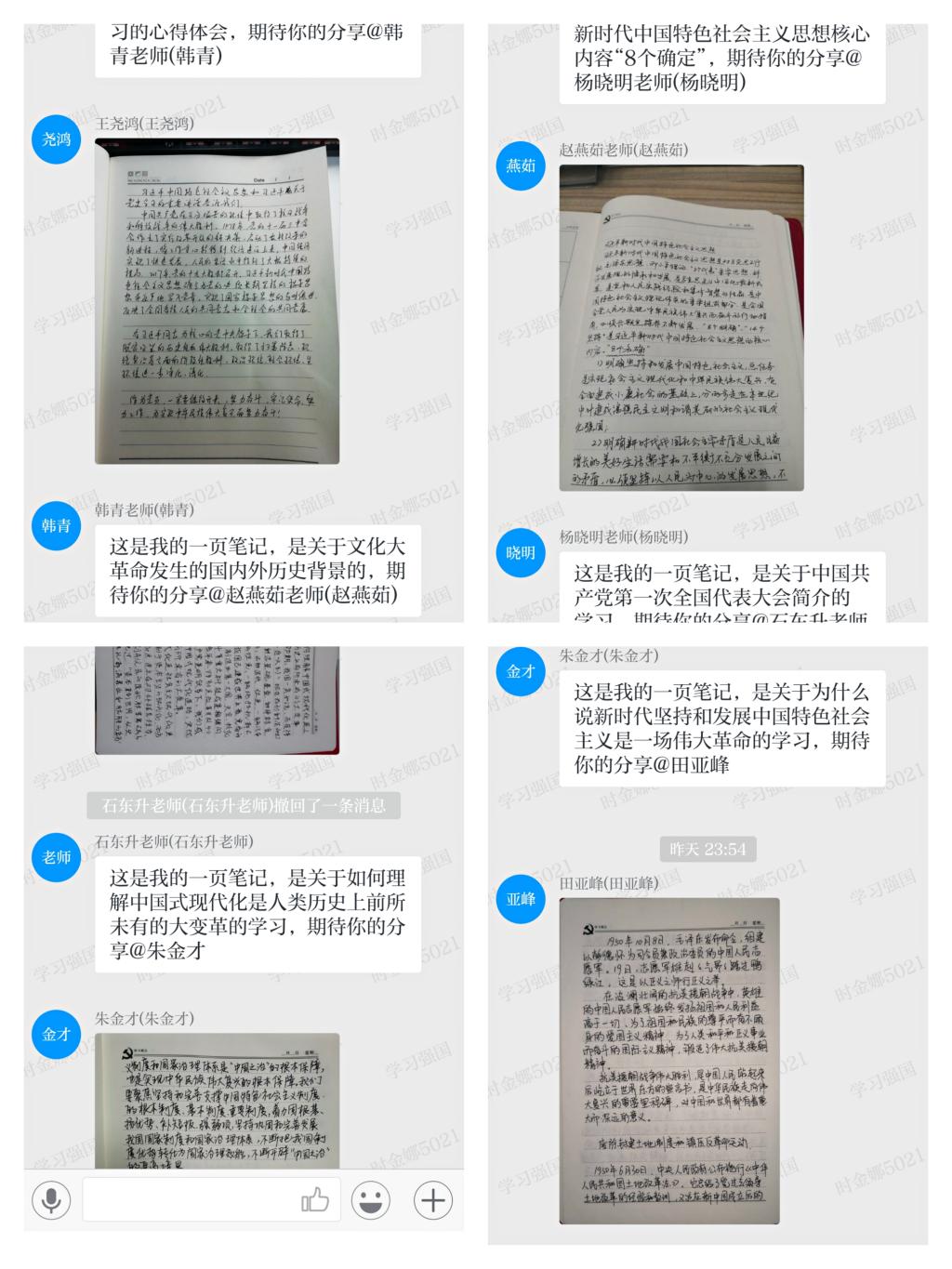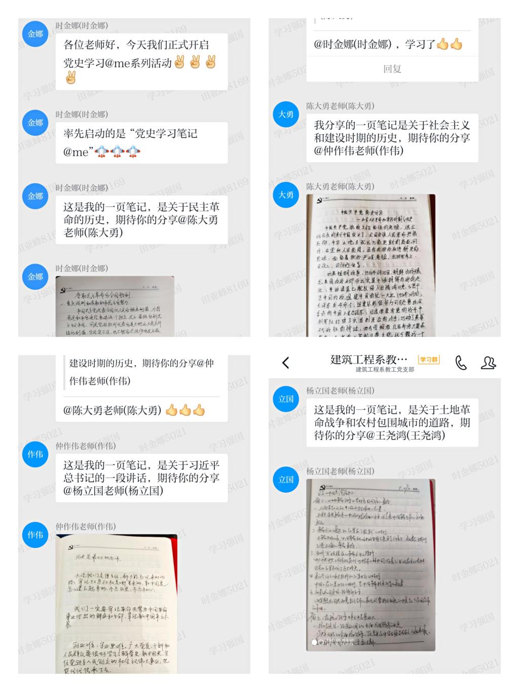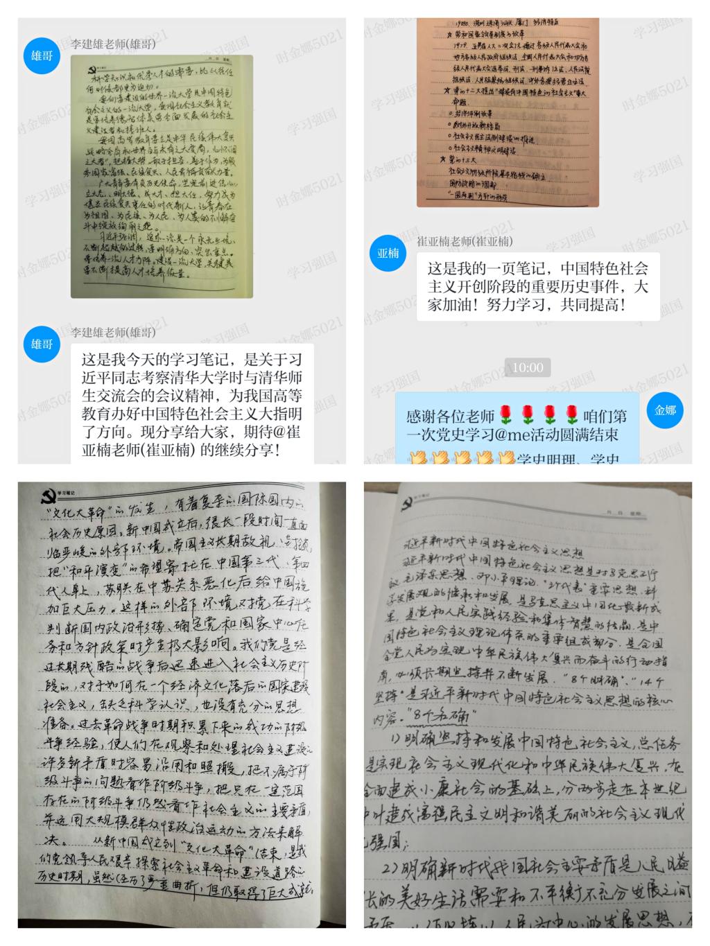 5月27日,举行了“党史学习@me”活动之“党史学习笔记@me”活动,党员挑选自己笔记中最满意的一页在“学习强国”平台的学习群进行展示,阐述展示内容并@希望继续展示的党员,支部党员依次进行。党员在选择展示页的同时可重新温习自己的学习笔记,加深对党史的认识;笔记展示过程中,党员之间互相学习、互相鼓励,更加激发了党员党史学习的兴趣;支部党员工整的笔迹更体现了大家积极学习的态度。