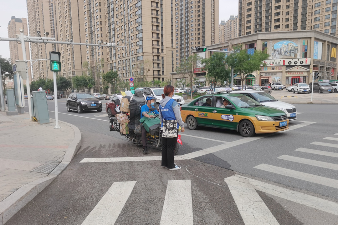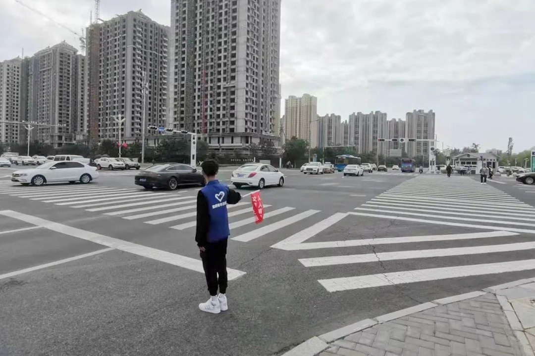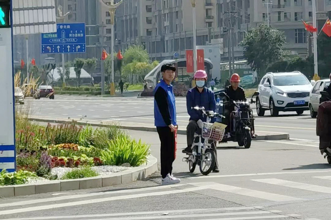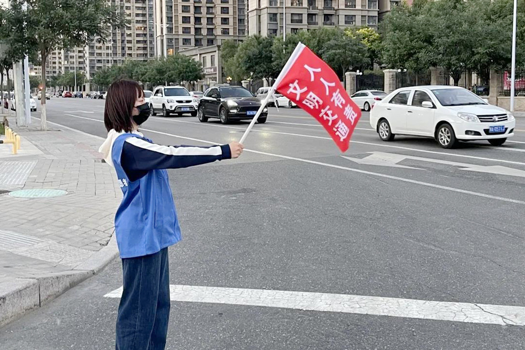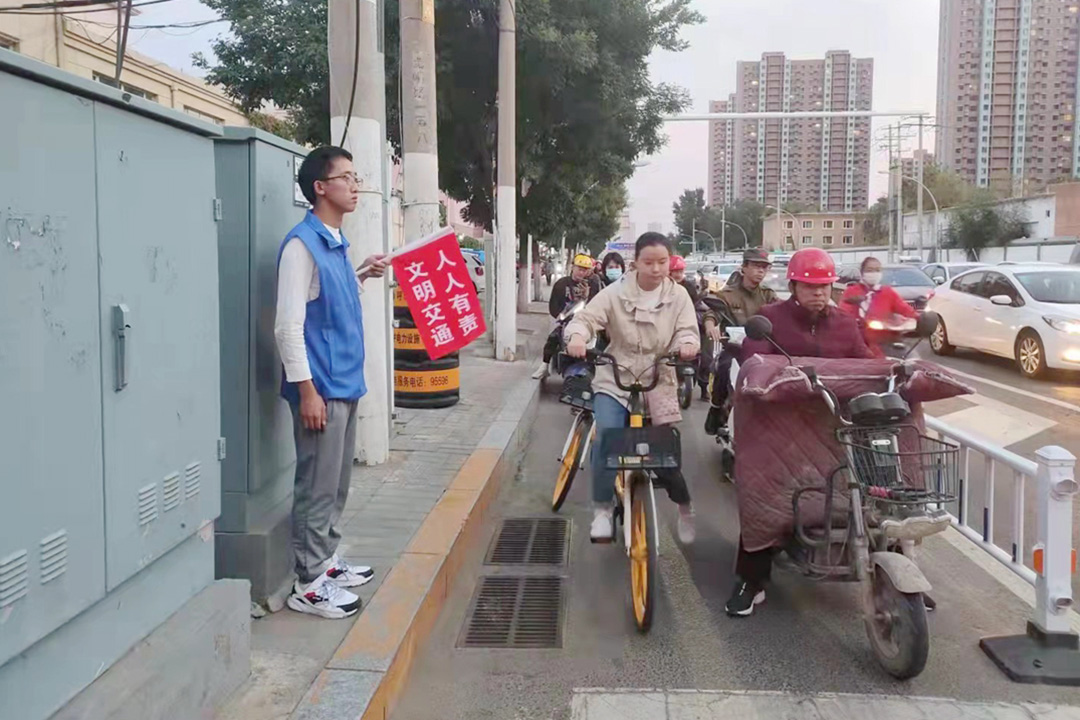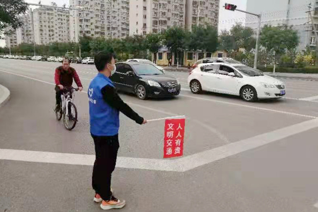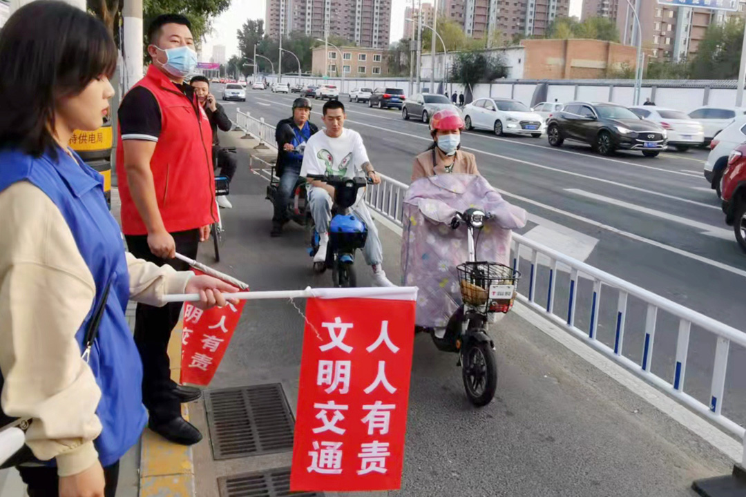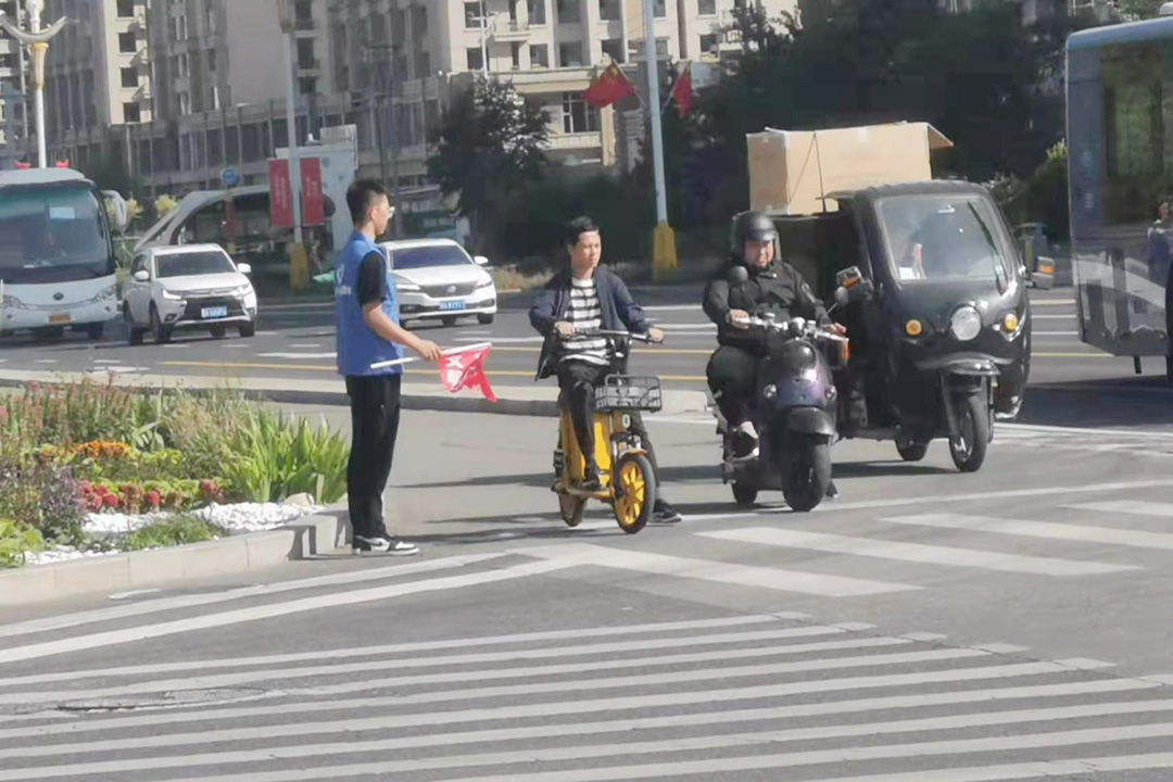 每天早晨七点半至晚上六点半,四班时间,在新城区人和路口,成吉思汗公园东口,恒大城路口,都会有一群穿着蓝色志愿者服,手持印有“文明交通、人人有责”小红旗的身影现身街头,与执勤交警一起劝阻交通违法,开展交通文明礼让宣传,通过警民共建,创造良好的交通环境。