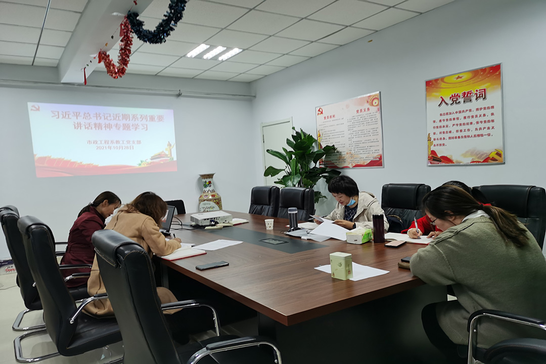 10月28日下午,市政工程系教工党支部开展习近平总书记系列重要讲话精神专题学习。会议由支部书记云霞主持,支部党员共5人参加会议。