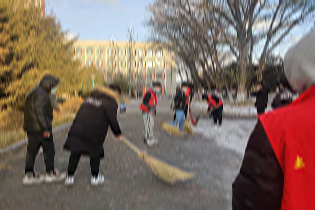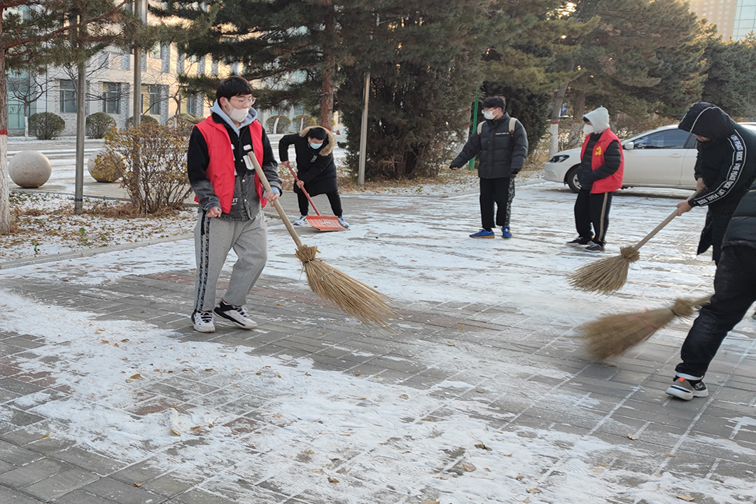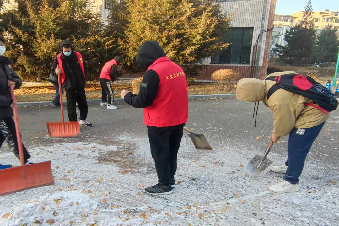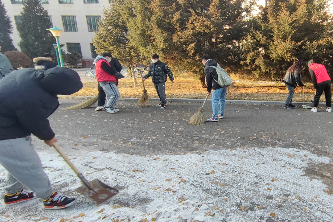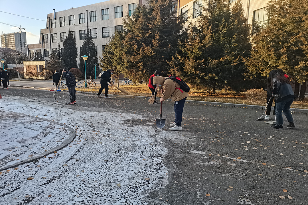 大家拿着铁锹、扫帚等工具进行积雪清理、铲除道路上的结冰。虽然天气严寒,但丝毫没有影响大家的热情和工作效率。大家团结协作,干劲十足,很快就将土木馆前的结冰以及落叶铲除干净,确保了道路的畅通,也降低了师生的出行隐患。大家扫雪铲冰的身影为银装素裹的校园增添了一道靓丽的风景,给寒冷的冬日校园带来了温暖。