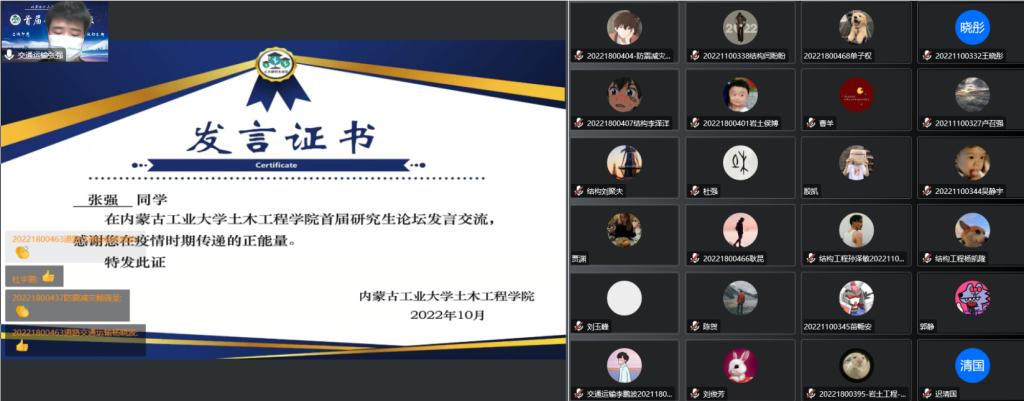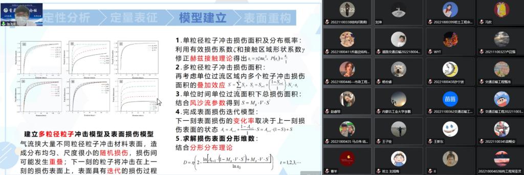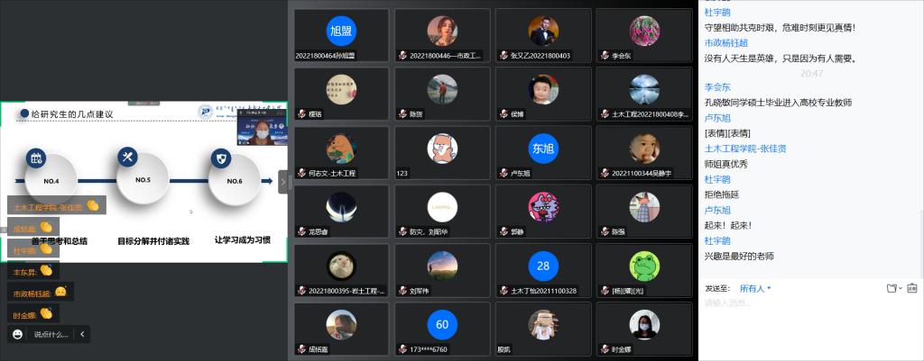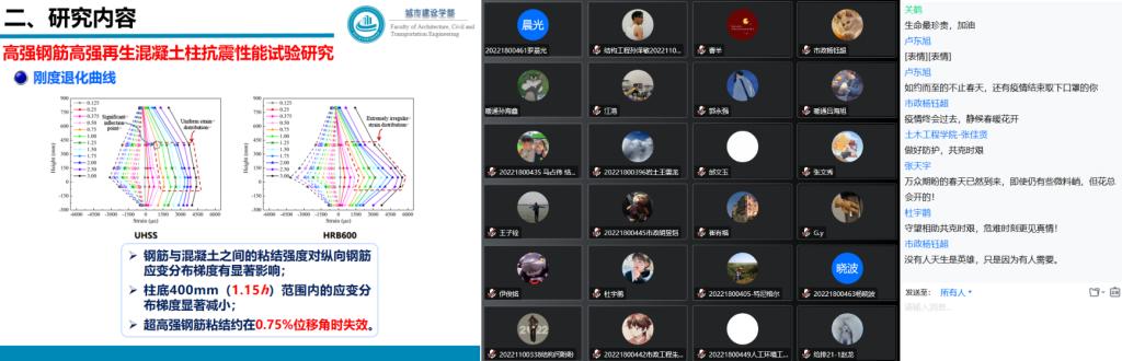 带来最后五场报告的主讲人为beat365正版硕士研究生毕业的优秀员工。报告分别为北京工业大学在读博士生刘潇带来的《可恢复功能高强再生混凝土框架结构抗震性能研究》、重庆大学在读博士生张飞龙带来的《实用科研方法介绍》、中国科学院成都山地灾害与环境研究所在读博士王壮带来的《趣谈川藏线》、工作于安徽理工大学环境与给排水工程系的孔小敏带来的《科研生活与就业》以及天津大学在读博士生谢妍带来的《科研方向转化心得》。五位员工的报告为在校员工带来了灵感上的启发,拓宽了员工的视野和思路,激发了师生们浓厚的科研兴趣,进一步坚定了同学们刻苦学习的信心,激发了疫情下同学们学习的热情。