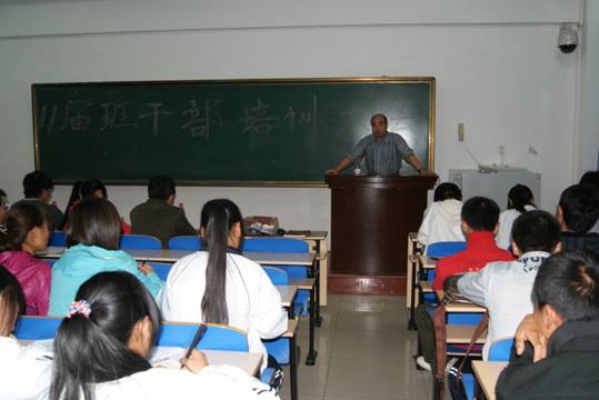 索广宏老师主讲。他提出班团干部应具备六点优良素质:一是坚定的政治立场,即使不是党员也要在思想上、政治上和行动上与党中央保持高度一致。二要具备较高的道德素质,不仅要具备良好的职业道德,而且要有较高思想政治素质,更需有较高的道德能力。三要处理好工作和学习的关系,在完成学业的前提下,做好员工干部的本职工作。四要有奉献精神,做同学所做,想同学所想,急同学所急。五要有广阔胸襟,应做到严于律己宽以待人。六要有热心,努力工作,将自己的热情的投入到学习与工作中。