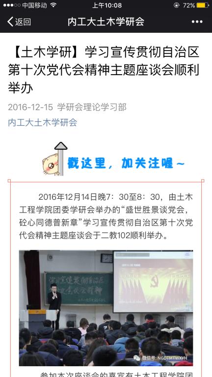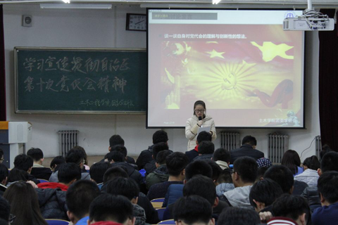 座谈会伊始,主持人传达了自治区第十次党代会主要内容和重要精神。随后,大家一起观看了员工自编自演的话剧《沧海清风》,通过严肃又不失活泼的表演方式,赢得了同学们的阵阵掌声,让大家再次意识到加强党的理想信念教育和优良传统教育的重要性。接下来,各小组分组讨论本次党代会重要内容和关键词,如“七个改变”、“四个着力”、“转型升级”、“中蒙俄经济走廊”等,各组代表结合学习、工作和生活实际与在场同学分享观点。交通15-1班的白桦、道桥16-3班毛鹏超和土木16-5班郝煜分别发言。其中,白桦感慨地说:“我作为一个内蒙古人感到很骄傲,相信在不久的将来,自治区必会成为祖国北方一道靓丽的风景线。”