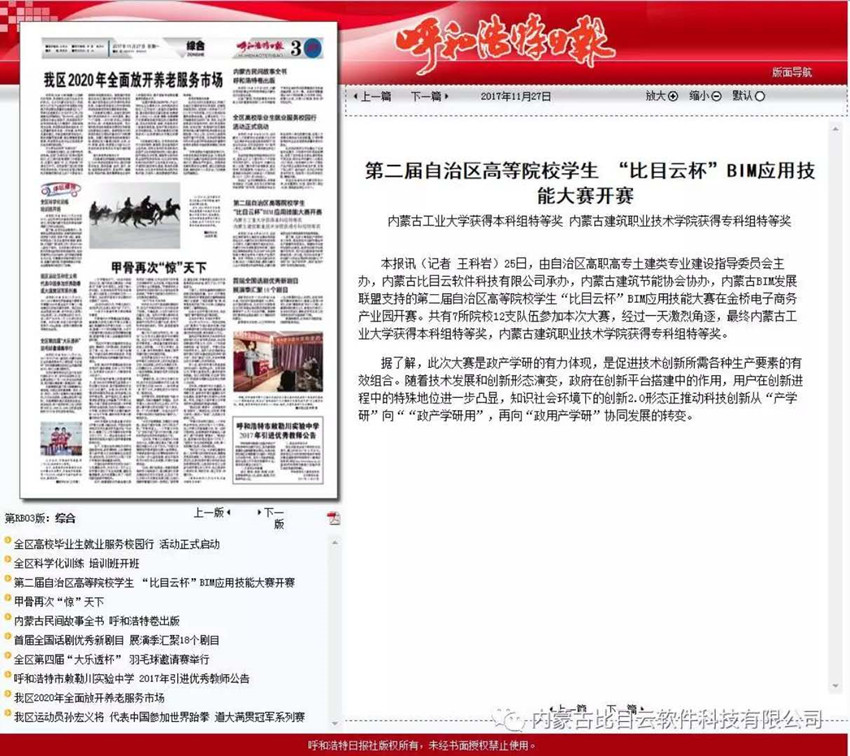 11月25日,第二届自治区高等院校员工“比目云杯”BIM应用技能大赛在呼和浩特市金桥电子商务产业园举办。公司四支代表队参加比赛,其中由冯斌、杜聪两位老师指导的BIM协会代表队荣获本科组特等奖,其余三只队伍分获一、二等奖。