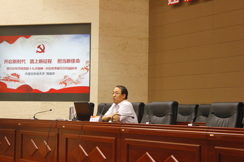 宣讲会特邀“学习贯彻党的十九大精神”全区高校优秀辅导员校园巡讲团成员,副研究员,自治区优秀党务工作者,国家二级心理咨询师,国家中级人才测评师,第四届全国高校辅导员年度人物,现任内蒙古农业大学后勤管理处副处长韩瑞平。他以《开启新时代踏上新征程担当新使命》为题,阐述了一个新思想,两个没有变,三个意味着,四个基本依据,五个本质内涵的意义,高度评价了我国过去五年的工作和历史性变革,并强调指出从党的十九大到二十大是“两个一百年”奋斗目标的历史交汇期,全国人民要不忘初心、牢记使命,以新姿态迎接挑战,以新状态踏上新征程。最后,韩瑞平以马克思、毛泽东、习近平为例,期望师生做到爱国,励志,求真,力行,在实现中华民族伟大复兴的进程中交出不负时代不负青春的历史答卷。