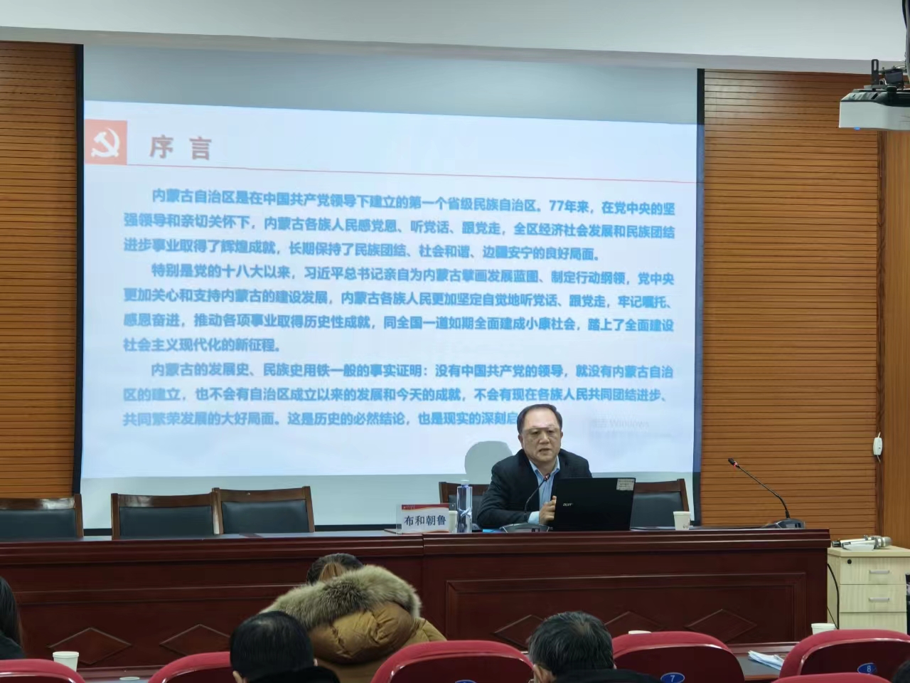 在主题宣讲中,布和朝鲁教授以通俗易懂的语言,生动的历史事实,详实的案例数据,阐释了“五句话”的事实和道理,阐释了习近平总书记对内蒙古的关怀厚爱和期望重托,阐释了国务院《关于推动内蒙古高质量发展奋力书写中国式现代化新篇章的意见》。