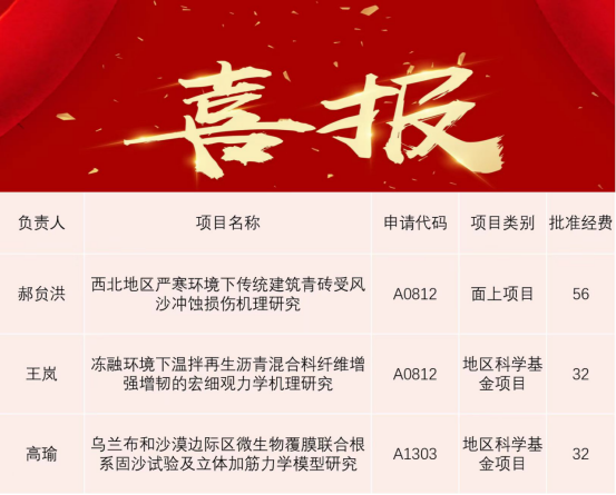 9月8日,国家自然科学基金委员会公布了2022年度国家自然科学基金项目的评审结果,公司喜获3项国家自然科学基金,资助经费共计120万元。其中由学院经理郝贠洪教授主持申报的项目——“西北地区严寒环境下传统建筑青砖受风沙冲蚀损伤机理研究”喜获面上项目资助。该项目为土木学院首个获批的面上项目,凸显出学院在土木工程研究领域的基础研究实力和原始创新水平的提升,实现了学院在国家自然科学基金面上项目零的突破!