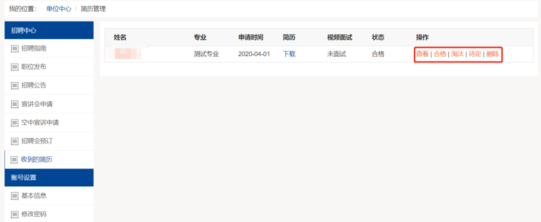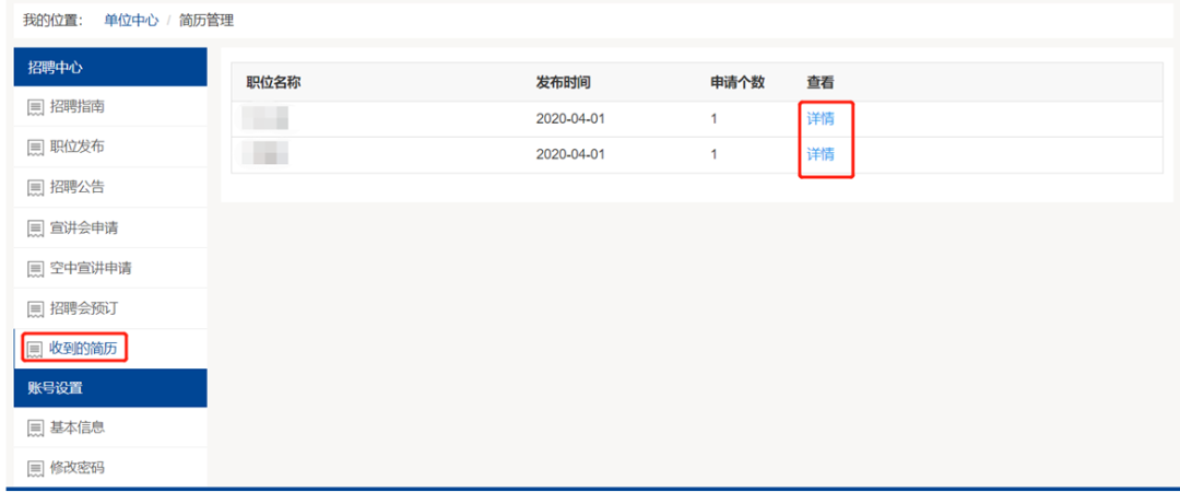 选择收到的简历查看职位投递情况进入详情筛选员工简历。