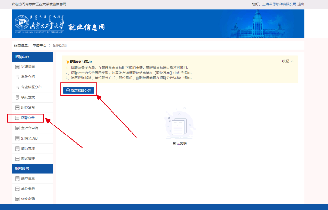 选择招聘公告发布点击“新增”按钮,进入发布页面填写相应信息后点击提交。