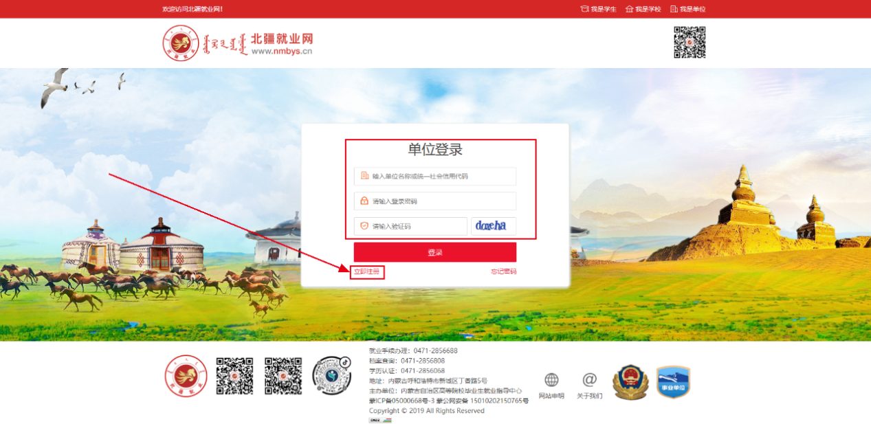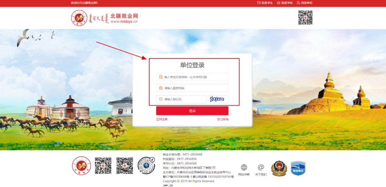 登录学校就业信息网(https://imut.nmbys.cn/),点击单位登录,会跳转到全区统一登录入口北疆就业网,如已注册账号直接输入进行登录,如未注册账号请点击“立即注册”如下图: