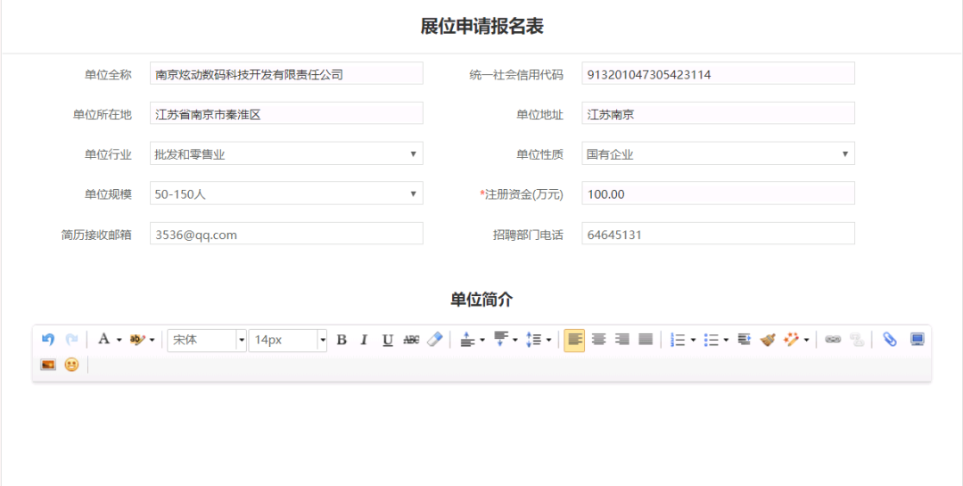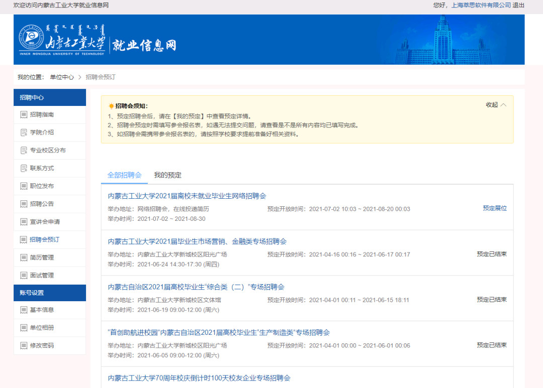 集团发布招聘会后,企业在招聘会预定栏目可以看到该招聘会,点击“展位预定”按钮即进入展位申请表页面填写相应信息后提交由学校进行参会资质审核,审核结果会以邮件形式通知。