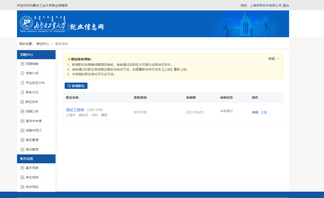 企业在就业网注册,经审核通过后,可以进行发布职位信息,招聘公告,申请宣讲会场地,预定招聘会展位等活动。