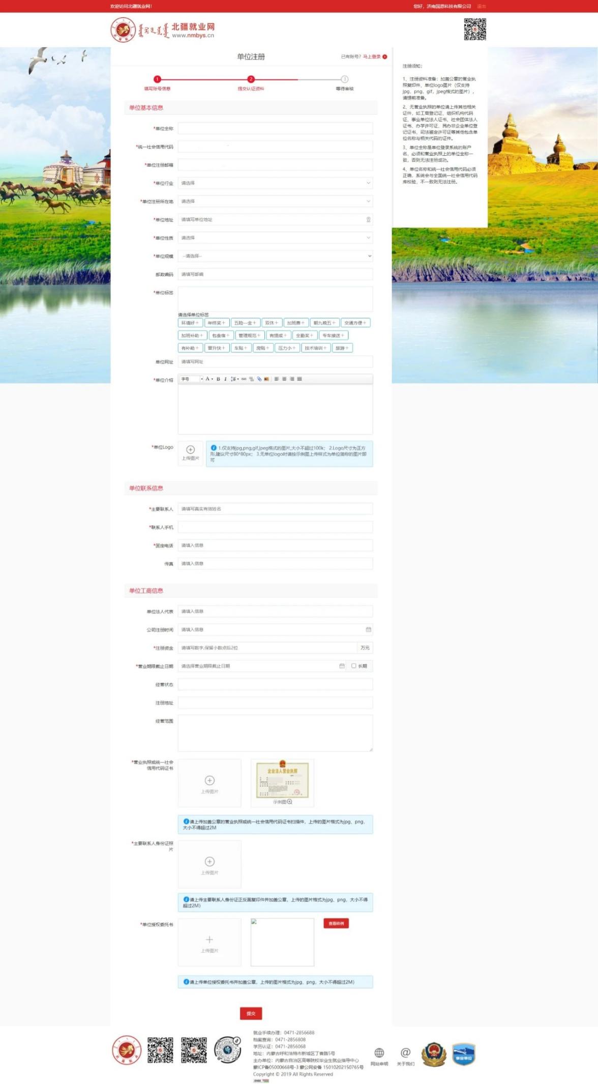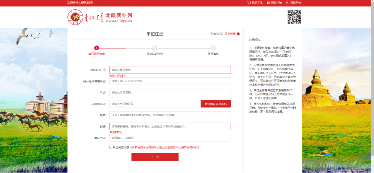 进入单位注册页面。注:(*号标注内容为必填内容;公司名称请填写营业执照上的名称)