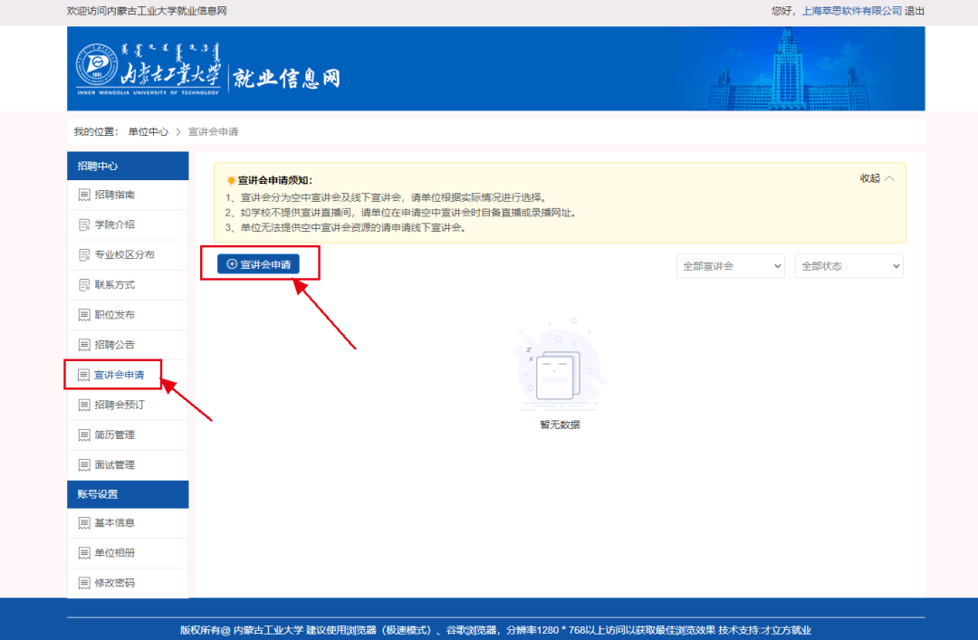 企业申请在校举办宣讲会,选择宣讲会申请点击“新增”按钮完善相应信息后点击提交。