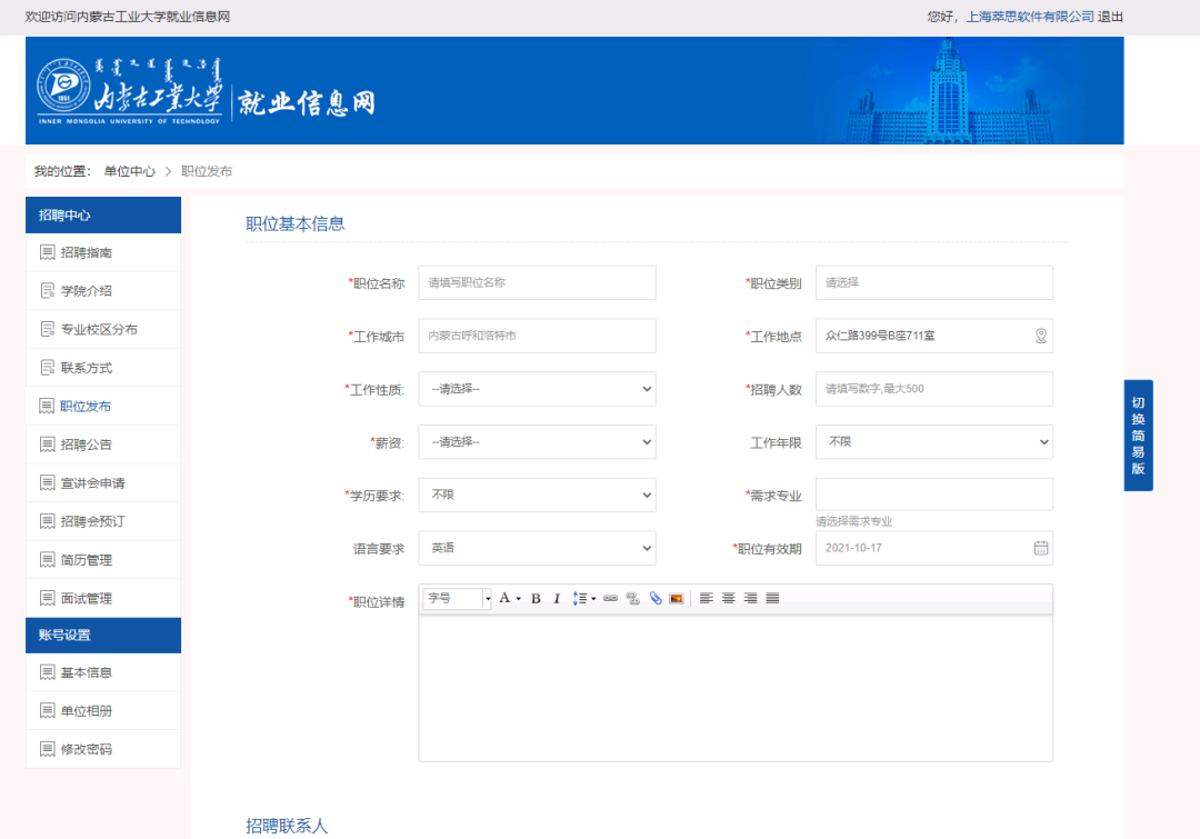 选择职位发布点击“新增职位”按钮,进入职位发布页面按需求填写信息后点击提交。