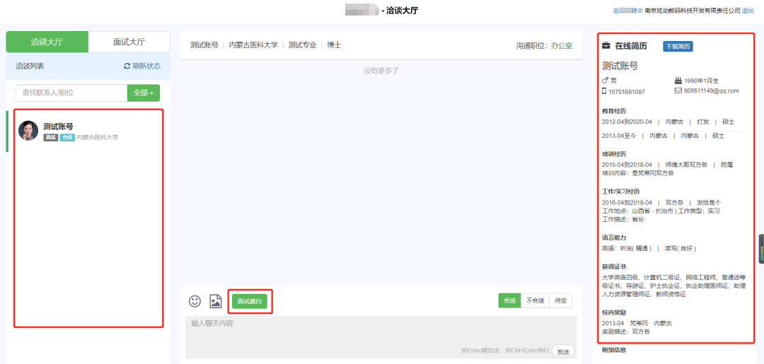 在招聘会预定处或招聘会详情页面进入“洽谈面试大厅”,左侧可看到投递简历的员工列表,右侧为员工简历,可跟员工进行文字交流或点击面试邀约设置面试时间发起面试即可,面试完成后可进行状态设置。