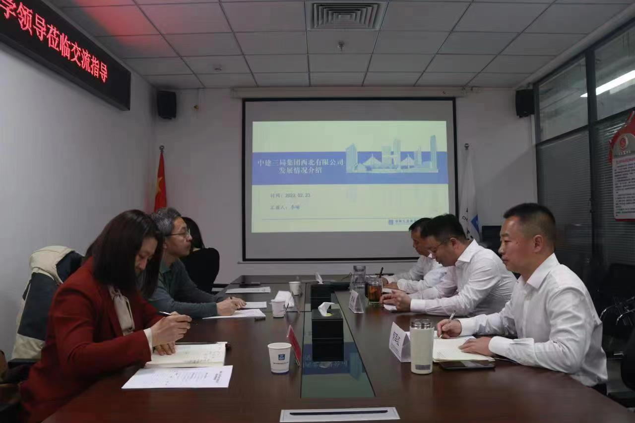 2月23日,公司党委书记张翔、副书记郭鹏、副经理时金娜走访中建三局西北公司第三分公司,调研交流,洽谈合作。公司执行总经理李琳、副书记何军红、总工程师晏文品、人力资源经理李来玉、员工代表等参加座谈。