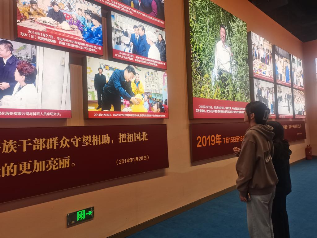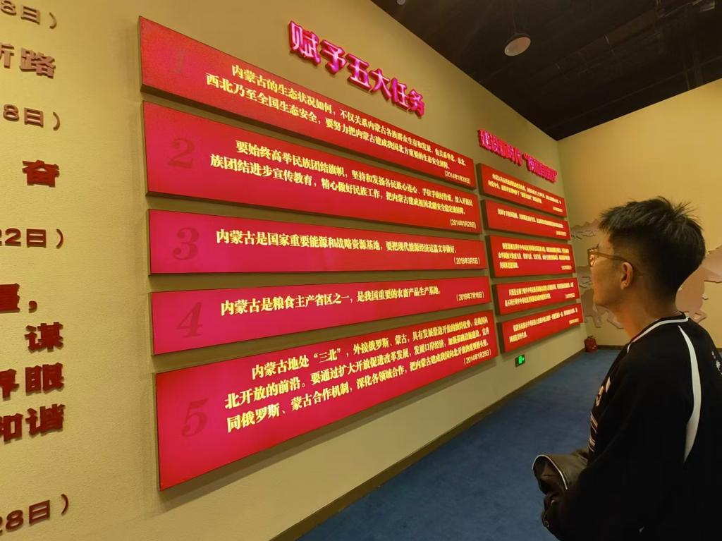 349幅图片、132幅文字版、60幅图表图例、230件实物展品、16组数字多媒体展项……一楼展厅内陈列着“牢记嘱托 感恩奋进——办好两件大事 奋力书写中国式现代化内蒙古新篇章”展览。该展览分为“人民领袖 情系北疆”“高瞻远瞩 把舵领航”“五大任务 担当奋进”“聚焦主线 模范前行”“人民至上 初心如磐”“勇闯新路 挺进中游”六大篇章,展览生动体现习近平总书记和党中央对内蒙古的关心支持和厚爱期许,深刻阐释了习近平总书记交给内蒙古的“五大任务”和全方位建设“模范自治区”两件大事的内涵,展示了首府各族干部群众“感党恩、听党话、跟党走”的生动实践。