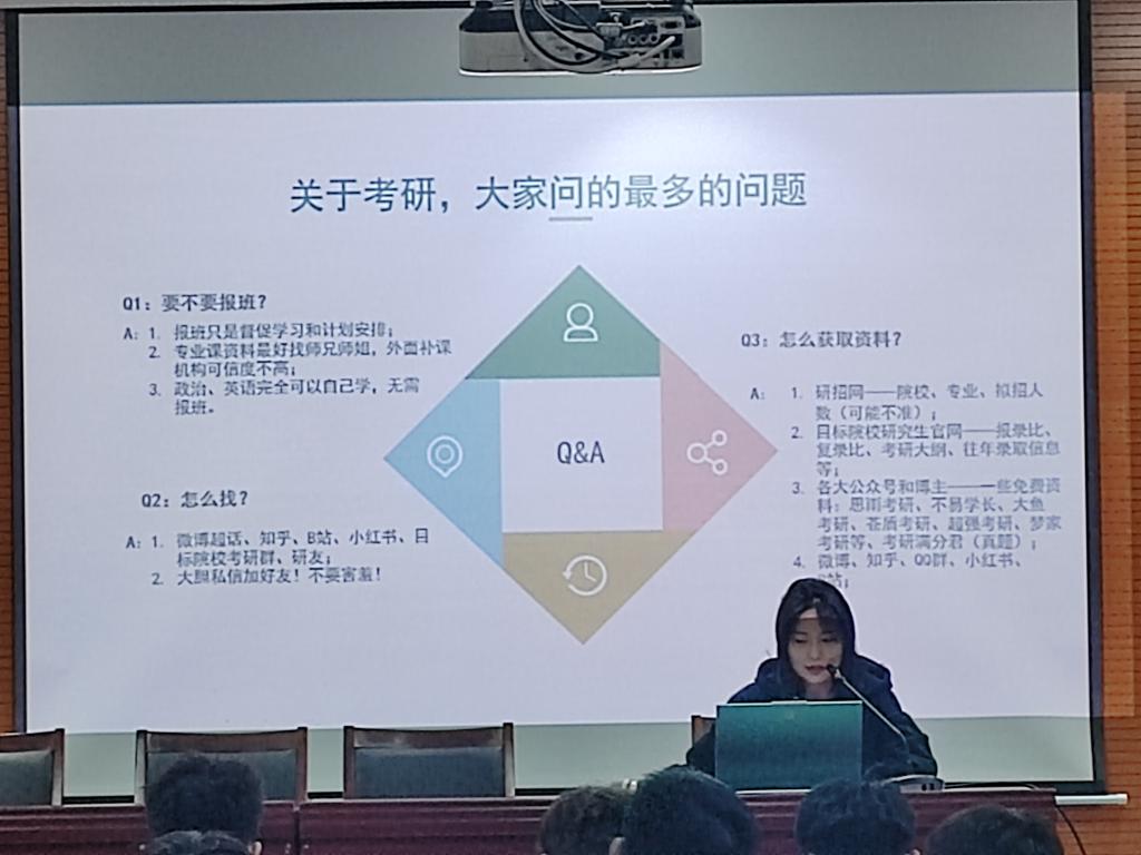 孙盼与同学们分享了考研各学科的时间安排、复习技巧等。强调做题不在于多而在于精,要吃透每一道题。同时,在紧张的复习过程中要劳逸结合适当休息。