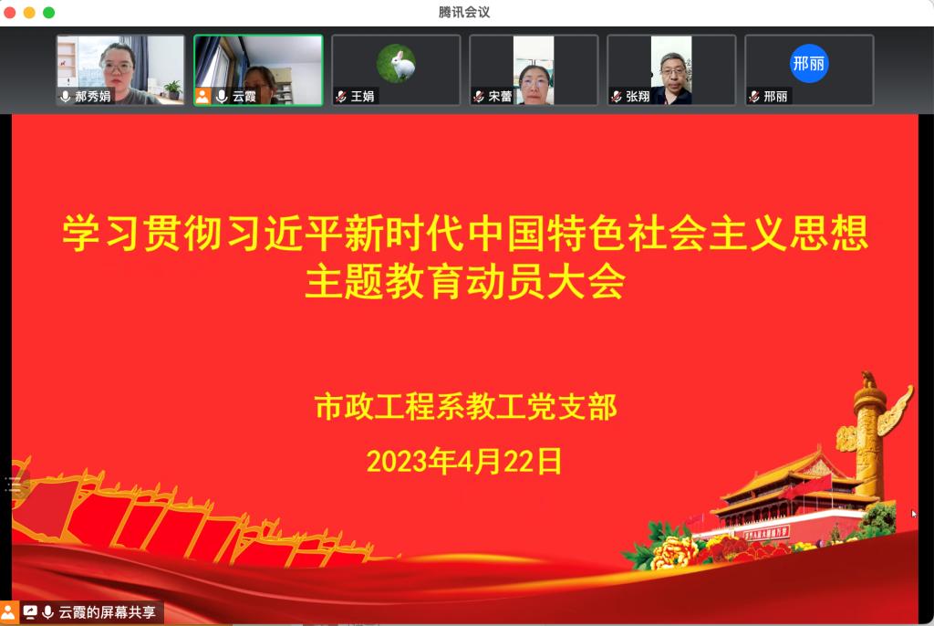 4月22日,市政工程系教工党支部线上召开了学习贯彻习近平新时代中国特色社会主义思想主题教育动员大会。支部7名党员参加会议,支部书记云霞主持会议。