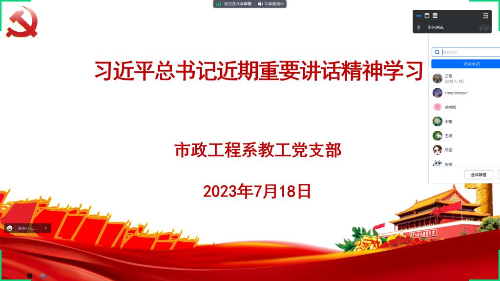 7月18日下午,市政工程系教工党支部线上开展习近平总书记近期重要讲话精神理论学习会。会议由支部书记云霞主持,支部全体党员参加会议。