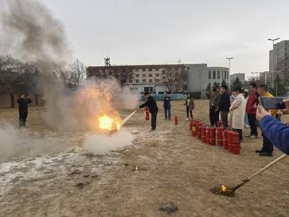 安全教育结束后在学校铅球投掷场地进行模拟火灾场景和灭火器使用演示和实操。在演练现场布置模拟火灾场景,师生在模拟火灾环境中进行疏散和灭火操作,体验火灾现场的危险和紧张氛围。详细讲解灭火器的构造、工作原理、使用方法和注意事项,并通过实际操作演练,如手提式干粉灭火器的“一提、二拔、三握、四压”操作方法,确保师生能够正确使用灭火器。